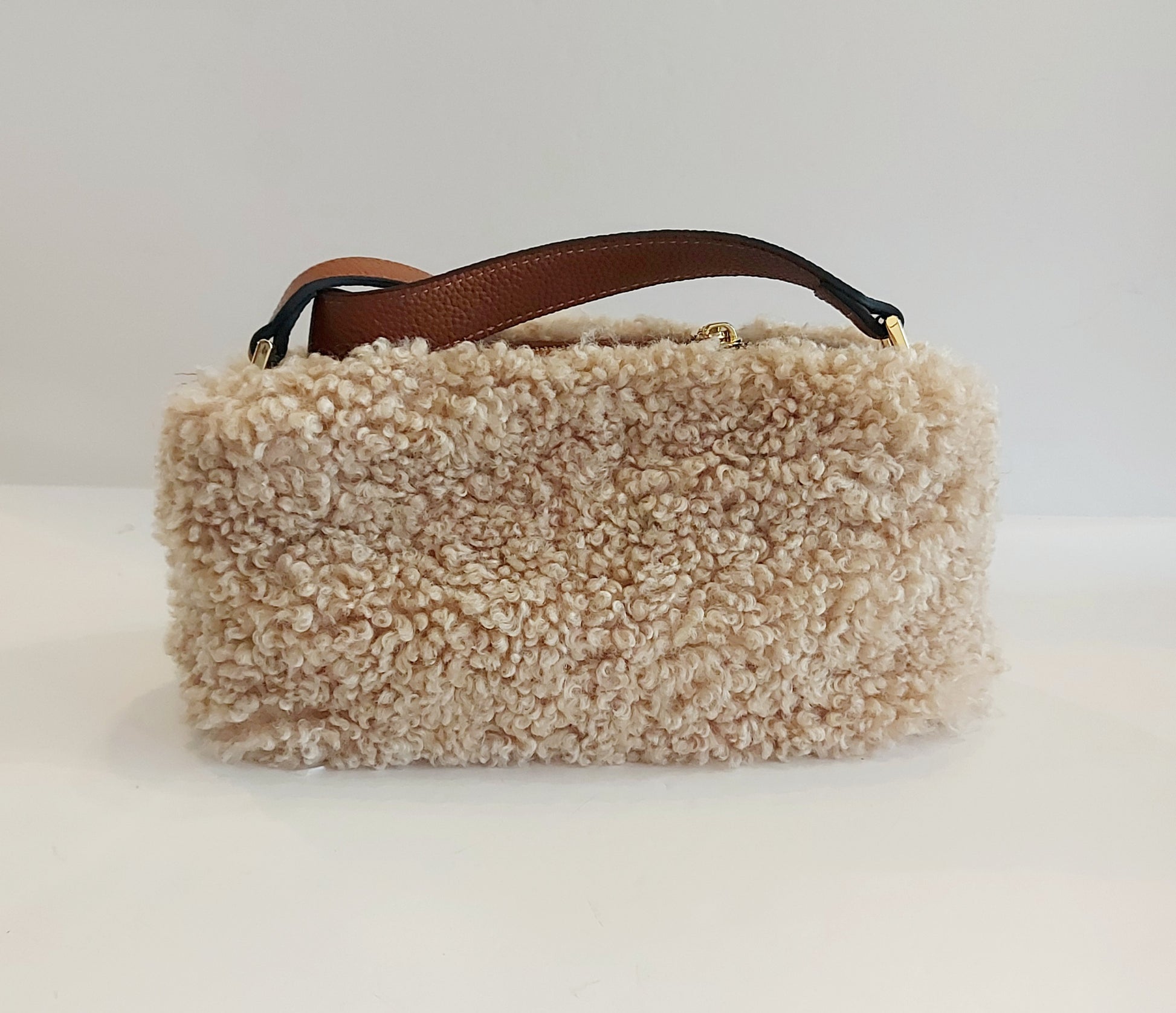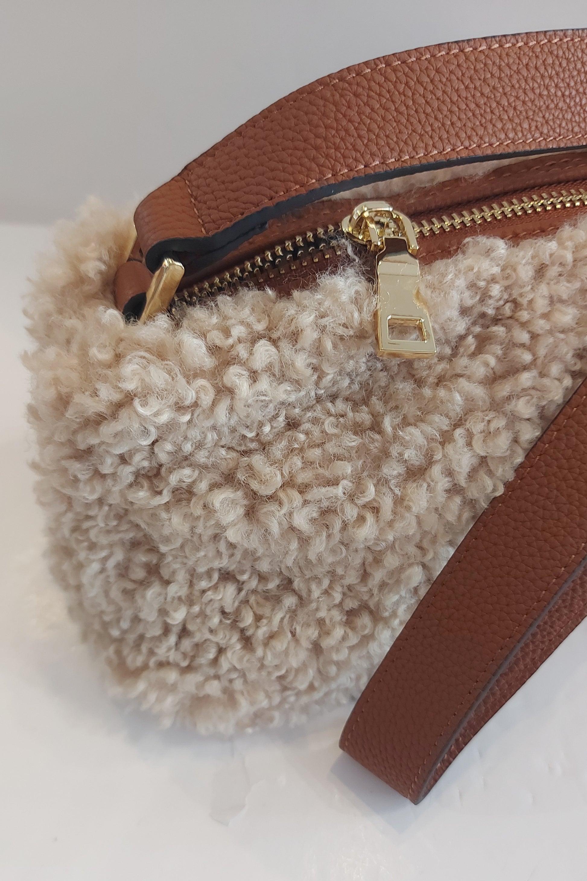 Luxuriously soft faux shearling bag with real leather strap & base