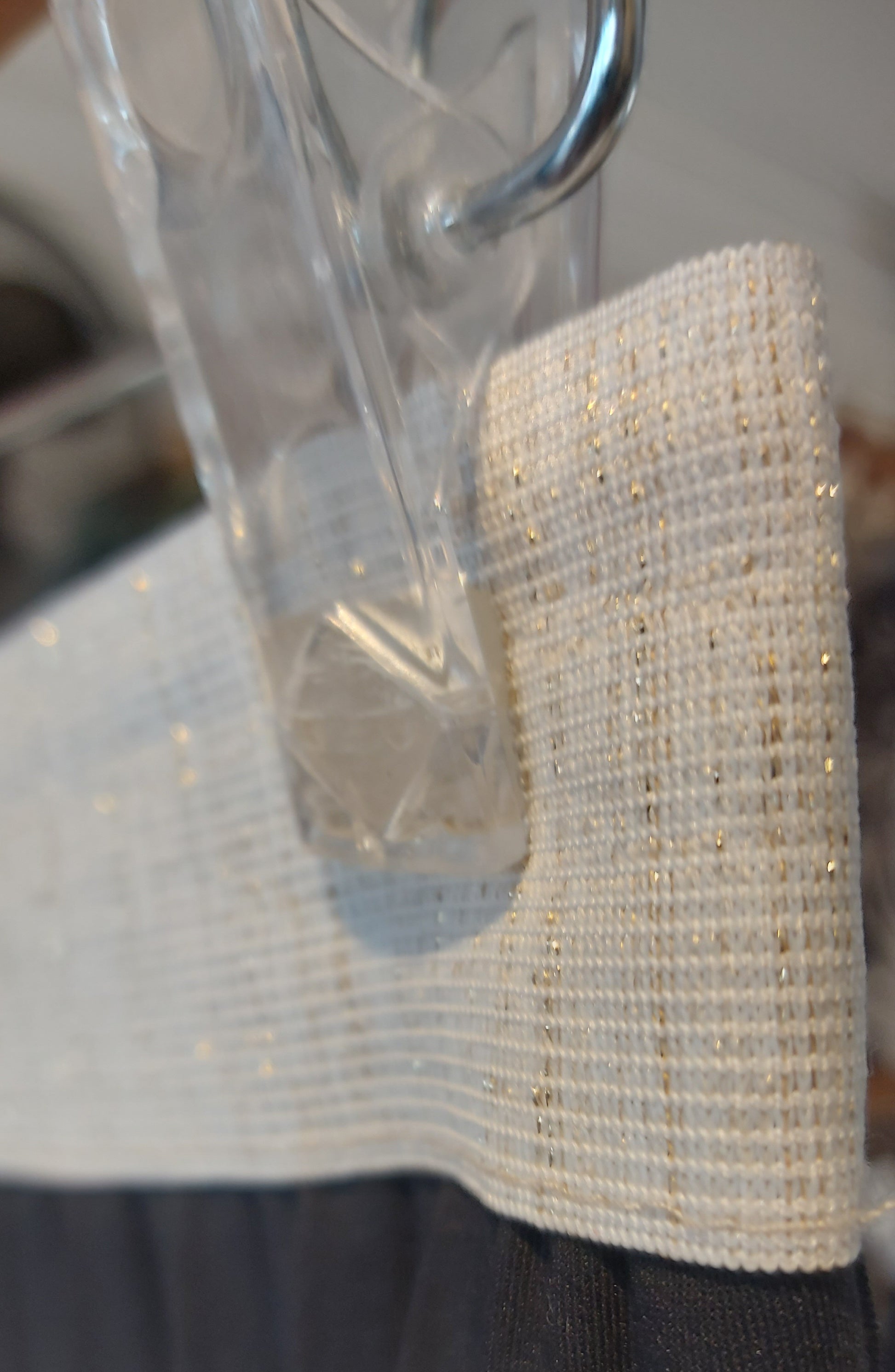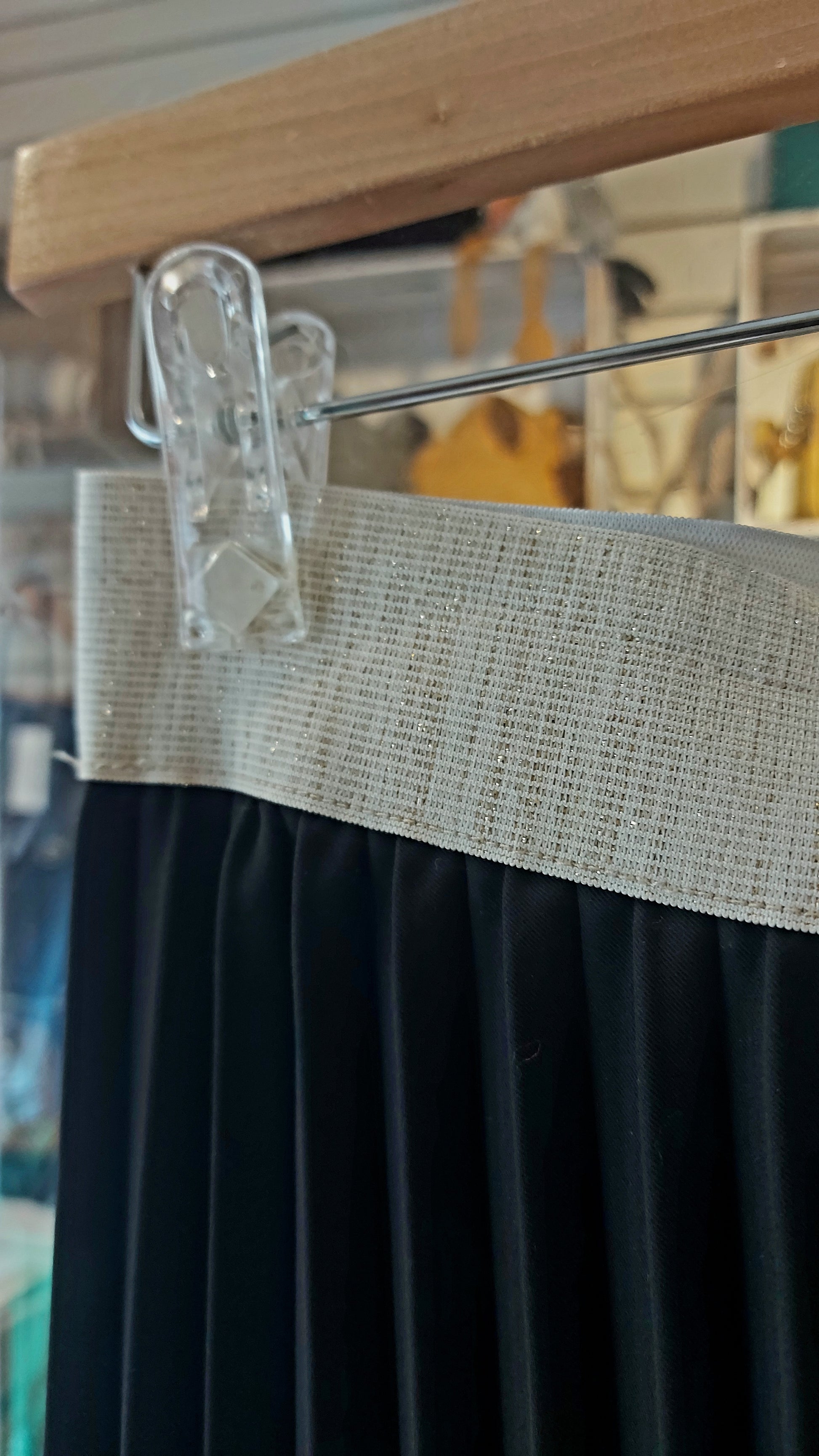 Great feel pleated fabric with a stretchy, gold threaded, wide waistband